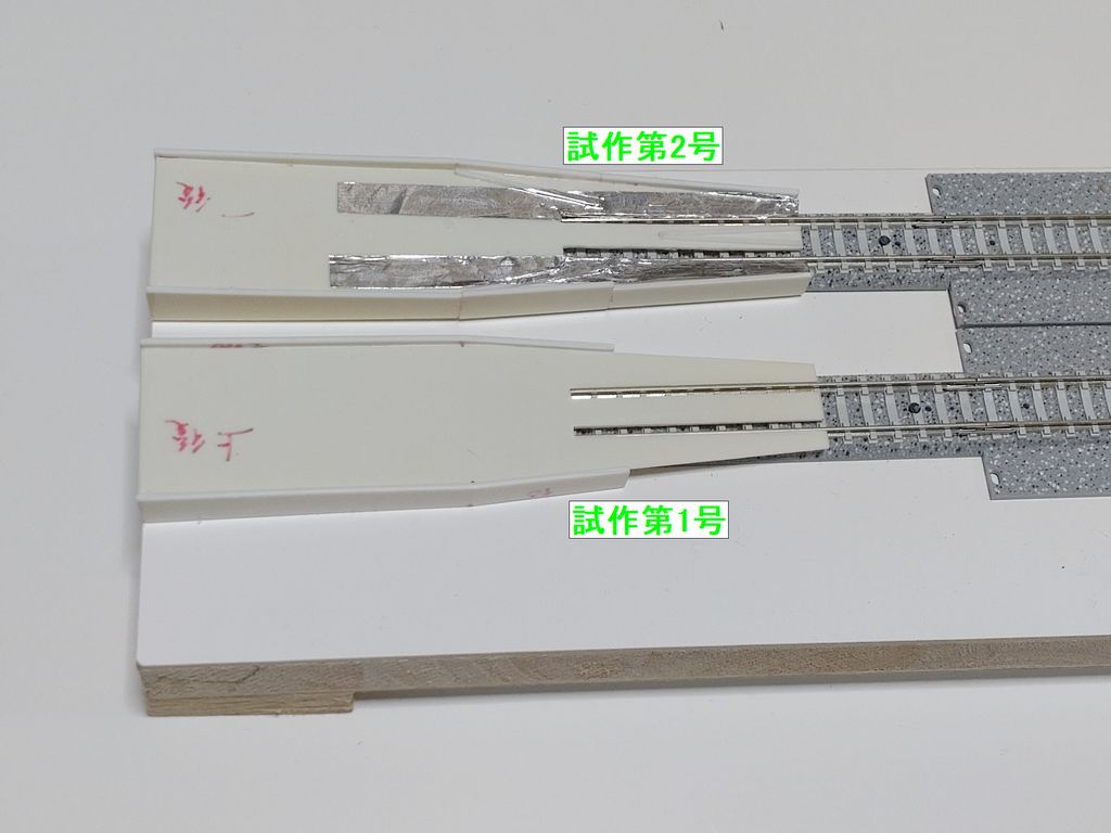 【試作】通電リレーラー通電動作試験 【試作】通電リレーラー通電動作試験 動作確認用のセクションレイアウト 完成編から続く。 サイトはこちら。 拡張部分のレールを追加し、可動範囲が長くなり動作試験の目的は達しています。 しかし、古い動力車の確認をする際に、都度レールに乗せるのが面倒臭く通電リレーラーの試作を試みました。 小型車の動作確認を中心にしているので、サイズは130mmと小型にしました。 横幅はよくサイズが判らなかったので、30㎜とし設計しました。 外形試作をしてみました。 試作第1号でトレーラにてテストしてみましたが、横から外れてしまう現象が続きました。 何となく良さそうに見えるのですが、やはりそんなに単純ではありませんでした。 話題休眠。 =広告= 未だに閑散としている羽田空港のお土産屋さんをサポートしませんか? 話を戻して。 試作第2号にて設計通り、中板にガイドを付けてみたところ、横転は減りましたが床下機器の接触の為、転倒が増える状況となりました。設計上は何ともなさげな数字なのですが、1㎜は大きいですね。 アクセス部にガイドを追加する事で外側に外れることが減りましたが、台車枠が接触して止まってしまいます。 床下機器や台車枠が接触したりして、ヤスリとの格闘が必須項目です。 少し落ち着いてきたので、アルミ箔で導通試験をしたところ良さそうだったので、そのままテストしてみました。 セクションに設置してテストした様子。 YouTube版はこちら。 試作第1号、第2号の比較の様子。 もう少し改良を加えて精度を上げたいと思います。 リフトジャッキの製作はいつになるやら。 =広告= PR