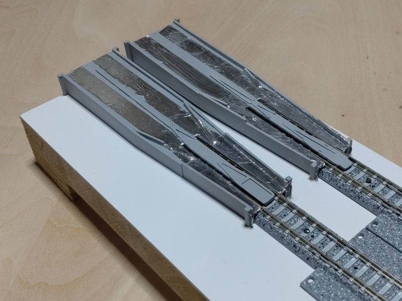 現状では、サーフェイサーで下地処理だけして動力台車などが接触するので、ガイドを削り調整してからアルミ箔を貼って動作試験をする予定です。