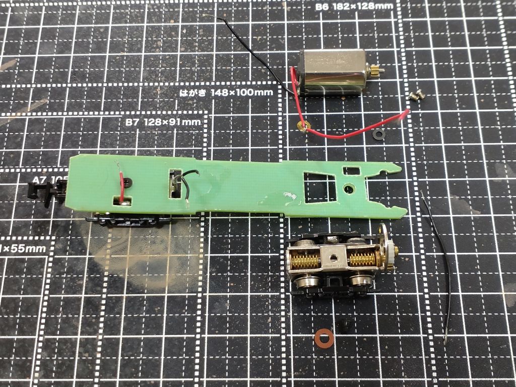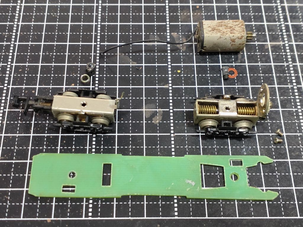 GM製旧動力ユニットの修理備忘録 GM製動力ユニットの修理備忘録 品番:592 品名:ブリル台車 今時こんな動力ユニットを持っている人は居るのでしょうか? また、それを修理しようとしている人など皆無だと思います。 グリーンマックスが最初に箱根登山鉄道モハ1・モハ2を製品化した際に販売された動力ユニットですが、改造のネタにして20年近く放置したところ、あまりに無残な姿になっていました。 流石にこれはいかんと修理を試みました。 実際は改造ネタを製作している最中に配線が外れていくと言うこの動力ユニットのあるあるに苦しみ、一度は修理を試みました。 当時の技術では如何ともし難く、車体の改造のみを先行して行っていきました。 改造ネタについては、後日報告をします。 話題休眠。 =広告= 不要な鉄道模型の処分に買取依頼を検討しませんか? 古いものを処分して、購入資金の足しにどうぞ。 話を戻して。 この動力ユニットについては、購入当時入手困難な雰囲気があったので予備を購入していました。 今となっては不幸中の幸いでした。 床板が今では信じられないような構造をしていました。 改造ネタに合わせて加工をしていたので、単純に入れ替えると言う訳にもいかず、また、同じような加工をするのも大変なので、動力部分を移植することにしました。 修理元の動力ユニットはこんな感じになっています。 過去の格闘した結果です。 修理元の動力ユニットですが、モーター、台車(車輪)が腐っており、これを交換していきます。 ゴムタイヤが痛い状態になっています。 新品は綺麗な物です。 交換作業に移っていきますが、作業途中で分からなくならない様に記録は残していきましたが、流石にここでは割愛していきます。 腐ったモーター台車を分解しました。 床板のベーク板は流石に経年劣化しないですね。配線は見るも無残になっています。 過去の激闘の跡がうかがえます。取り扱いの難しい代物であったのは事実です。 今でも正直余りいじりたくないですね。 交換元から動力部分を外し移植の準備をしました。 配線の一部は切断しないと分解出来ないので泣く泣く切断しました。 この後、組立てを行いましたが、配線について絶望的な事が起こりました。 組上げて試運転を行おうとしましたが、最初に集電台車の車輪の向きが反対でショートしていました。 これがこれから始まる悲劇の幕開けでした。 調整の為集電台車を分解したところ、集電シューが歪んでしまいました。 この修正に時間を取られ、落ち着いたところ半田が古いのか通電不良が発生しました。 修正をするには再度全部ばらして、半田を除去するしかなく、配線材もボロボロになるため、配線を全部交換する必要が出てきました。 20年以上の前の製品なので、メンテナンスの手間が掛かるのは判りますが、流石に使用できる様な配線材の手持ちは無く、秋葉原へ行かないと無理な為、今回はここで諦める事にしました。 次回は、配線を全て交換するところから、再開したいと思います。 配線を修理すれば使えると思いますので、頑張らねば。 配線材交換修理編に続く。 いつになることやら。