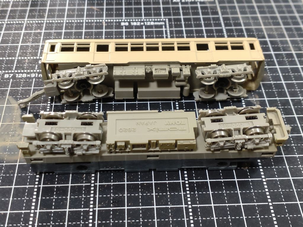 トミーテックキワ90動力化 トミーテックキワ90動力化 車両工作再開に際して手間の掛かる物は、途中で保留してしまいそうだったので、簡単なキワ90動力化としました。 これまでに調達した物で早急に取り掛かりたいものがあるのですが、作業が中断しそうなので後回しにしました。 トミーテックキワ90動力化ですが、他のBlog等で報告済みと思われ、また取り上げて新しい事もしていないので簡単にまとめます。 詳しくは、サイトを確認してください。 話題休眠。 =広告= 不要な鉄道模型の処分は買取を依頼してみませんか? 話を戻して。 本体と動力化ユニット。 この動力ユニットは色々と利用できそうなので、入手可能なうちに数を揃えておこうかと思っています。 本体と下周りを分解。 台枠は動力ユニット付属の物を使わずに交換します。 如何にもプラという質感なので、下周りだけでも塗装を行いました。 台枠の塗装が終わり、組立てを行いました。 完成の様子。 動力化しただけなので外観上の変化はありませんが、この状態で暫く楽しみたいと思います。 お時間があればサイトも確認してください。