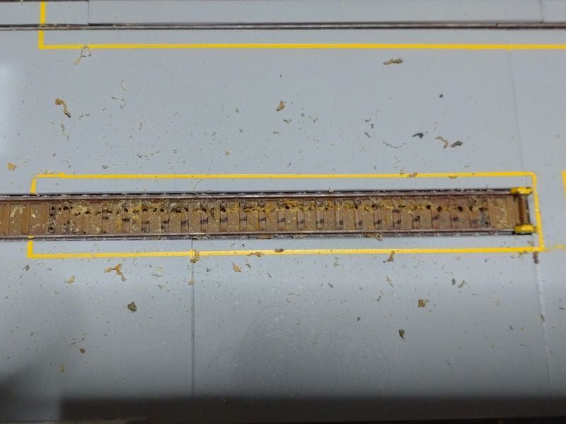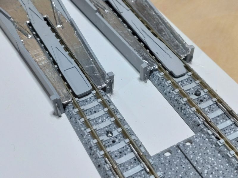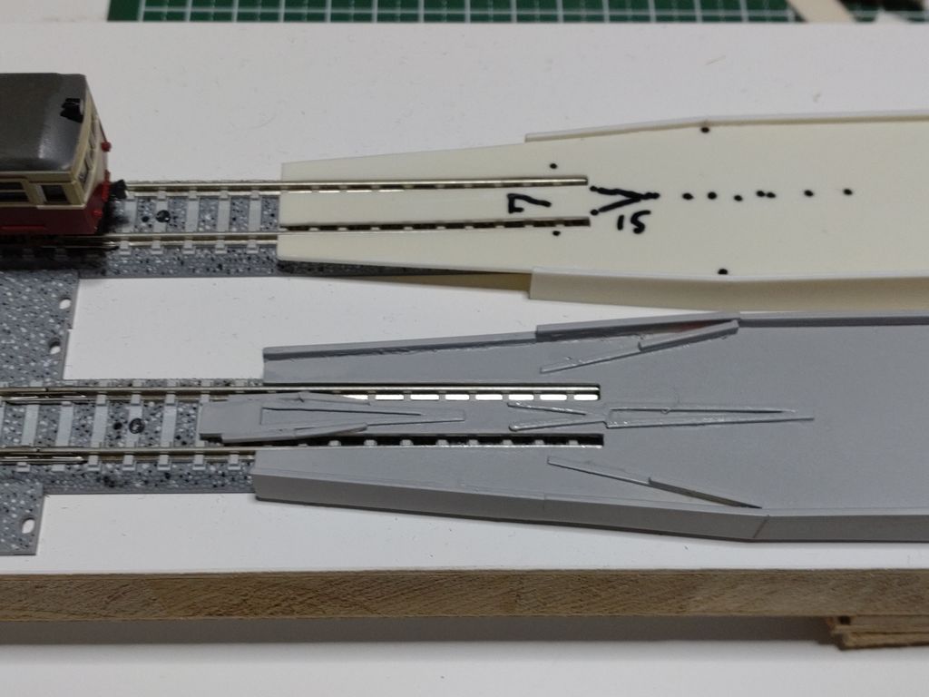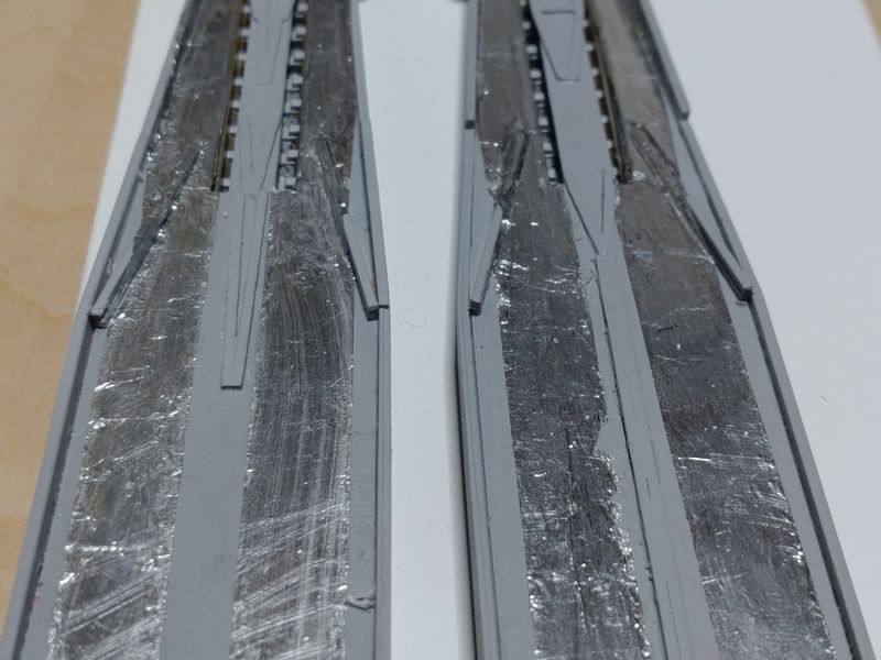 現状では、サーフェイサーで下地処理だけして動力台車などが接触するので、ガイドを削り調整してからアルミ箔を貼って動作試験をする予定です。