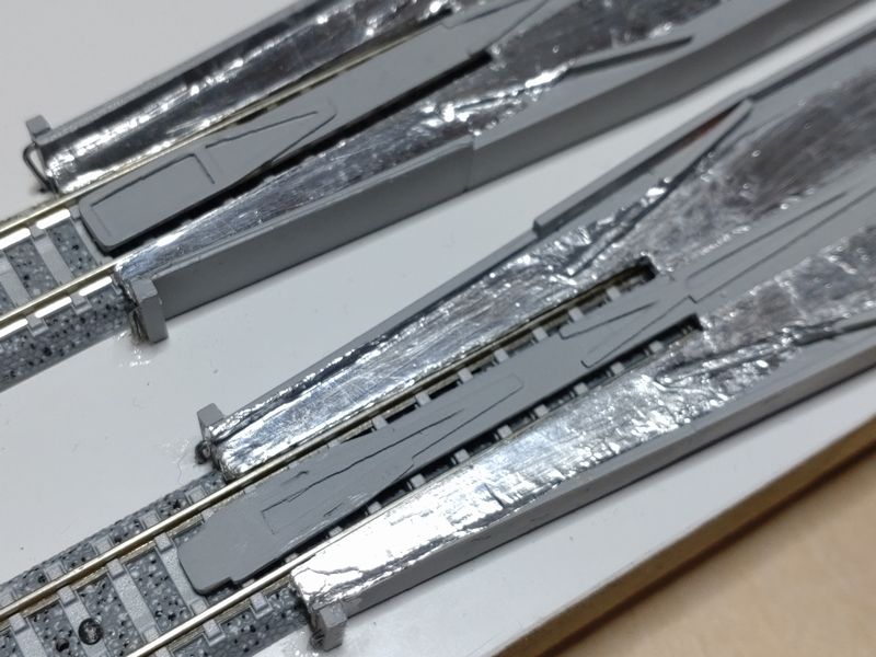 現状では、サーフェイサーで下地処理だけして動力台車などが接触するので、ガイドを削り調整してからアルミ箔を貼って動作試験をする予定です。
